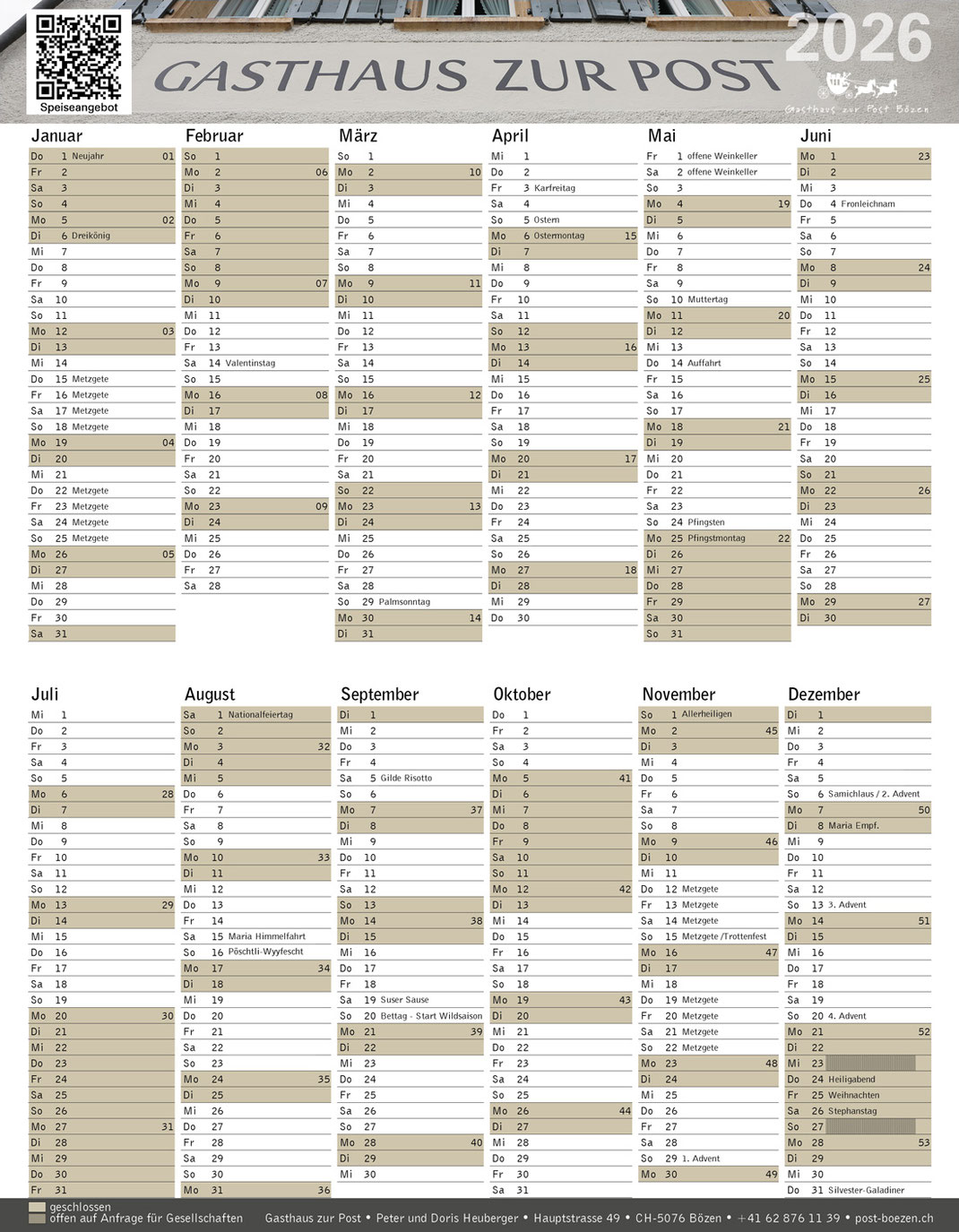 2026: 04.01. / 01.02. / 08.02. / 22.03. / 12.04. / 31.05. / 21.06. / 26.07. / 02.08. / 13.09. / 11.10. / 01.11. / 27.12.